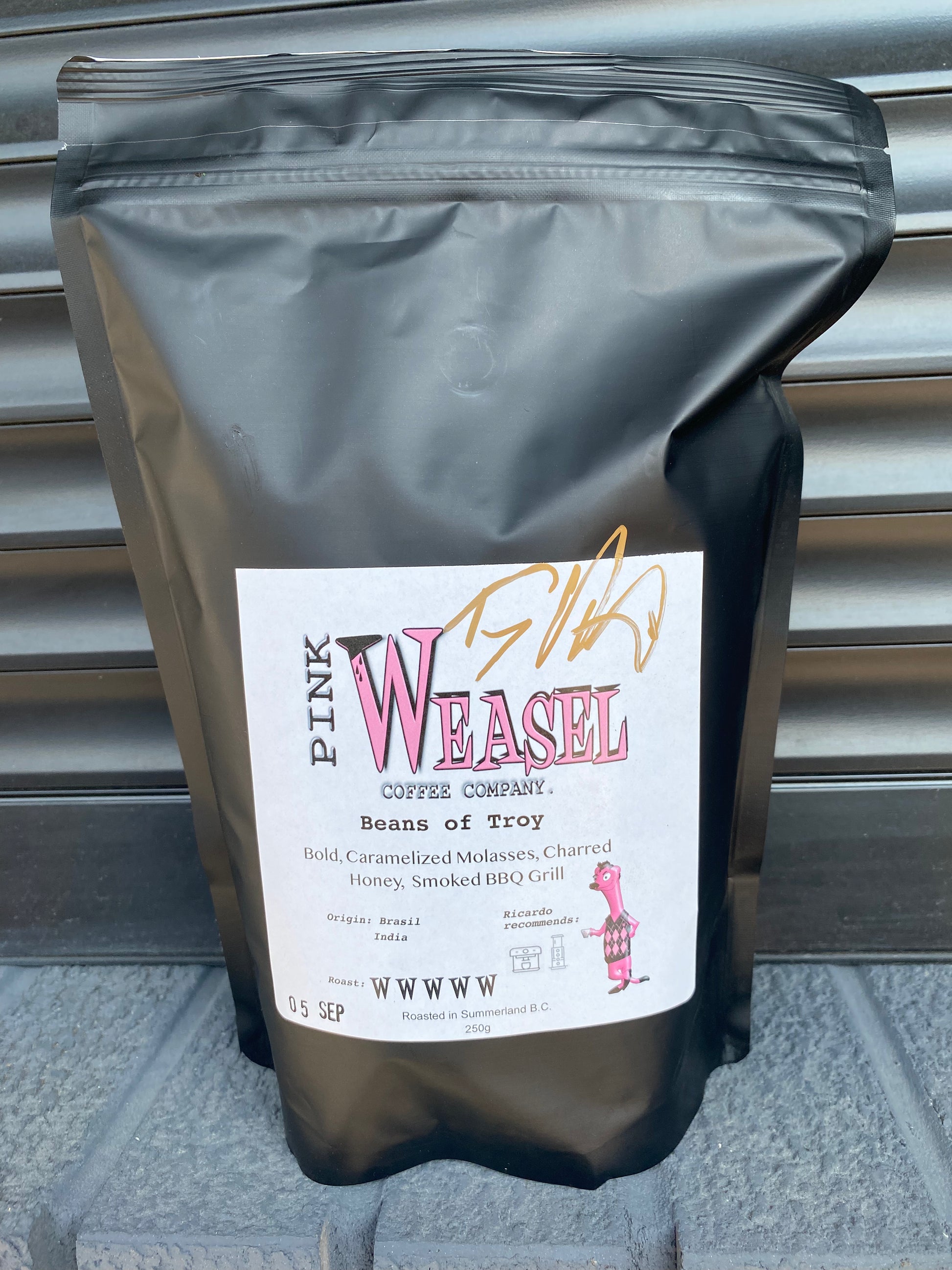 The Beans of Troy were created for a gent in the cycling club we sponsor. He wanted something with a bit more kick as his turbo boost for his big rides. So that's what we did. Your taste buds are going to get a little jolt here as we've pumped up the caffeine game also.